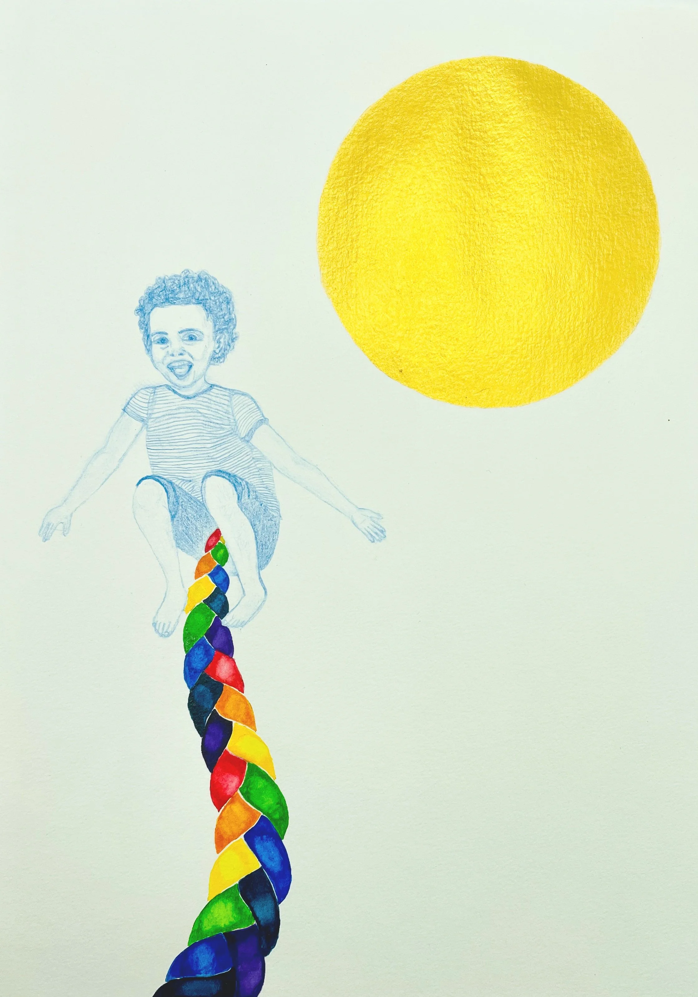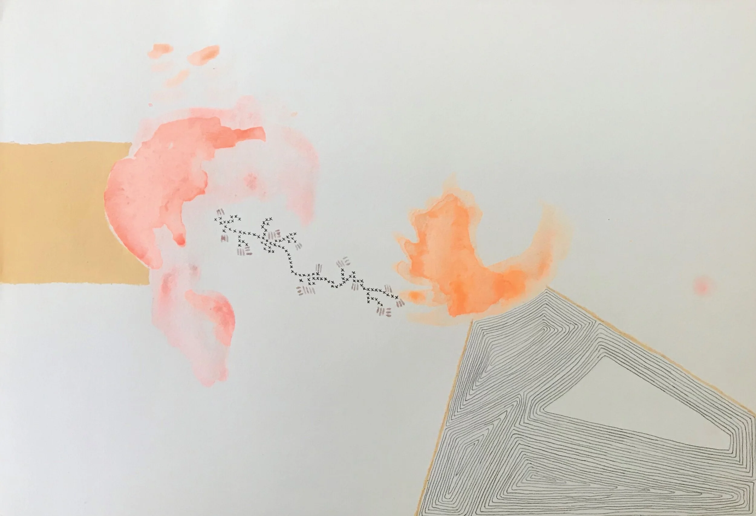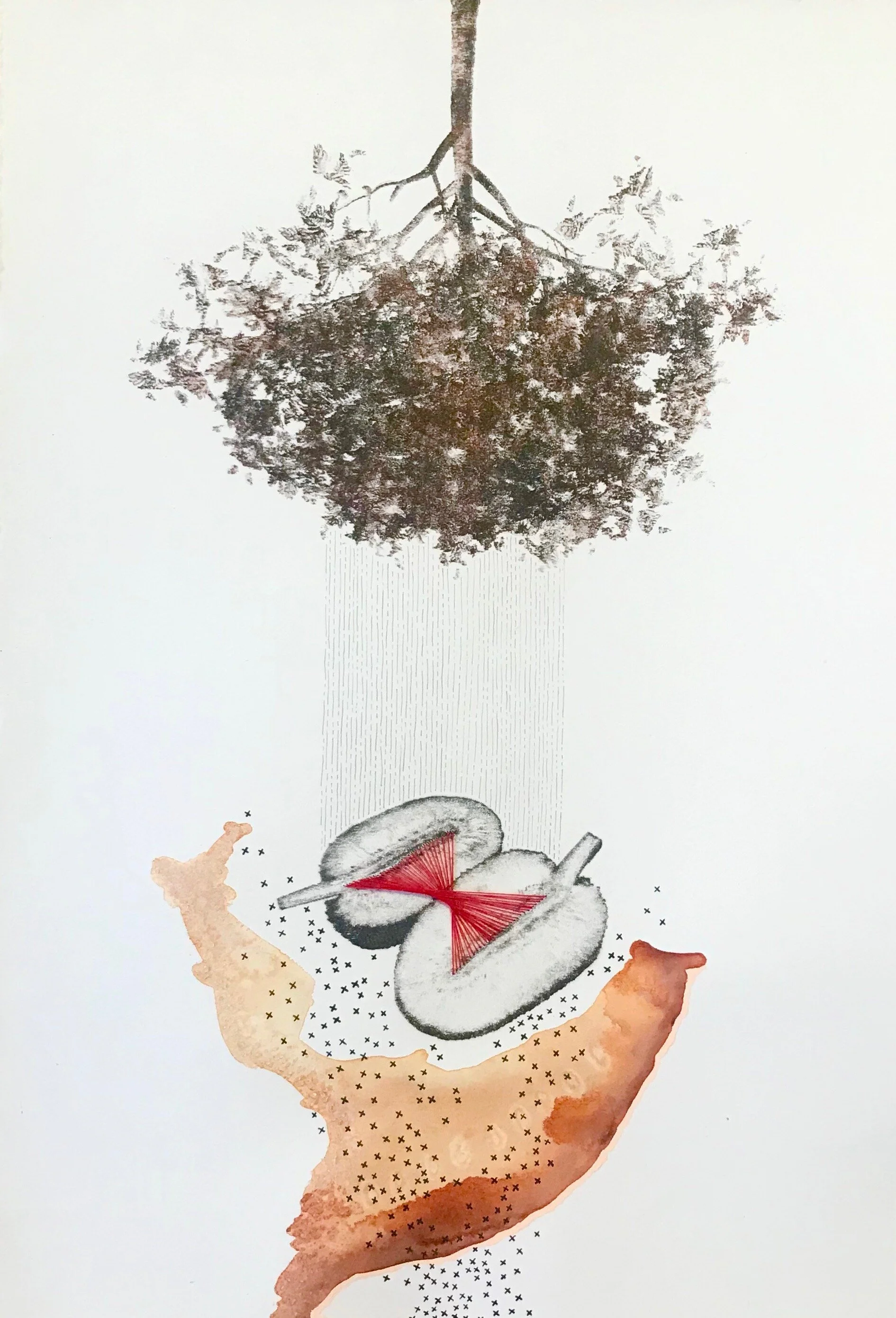 Watercolor, pencil, marker, photo transfer, thread, salt, and liquid acrylic on paper