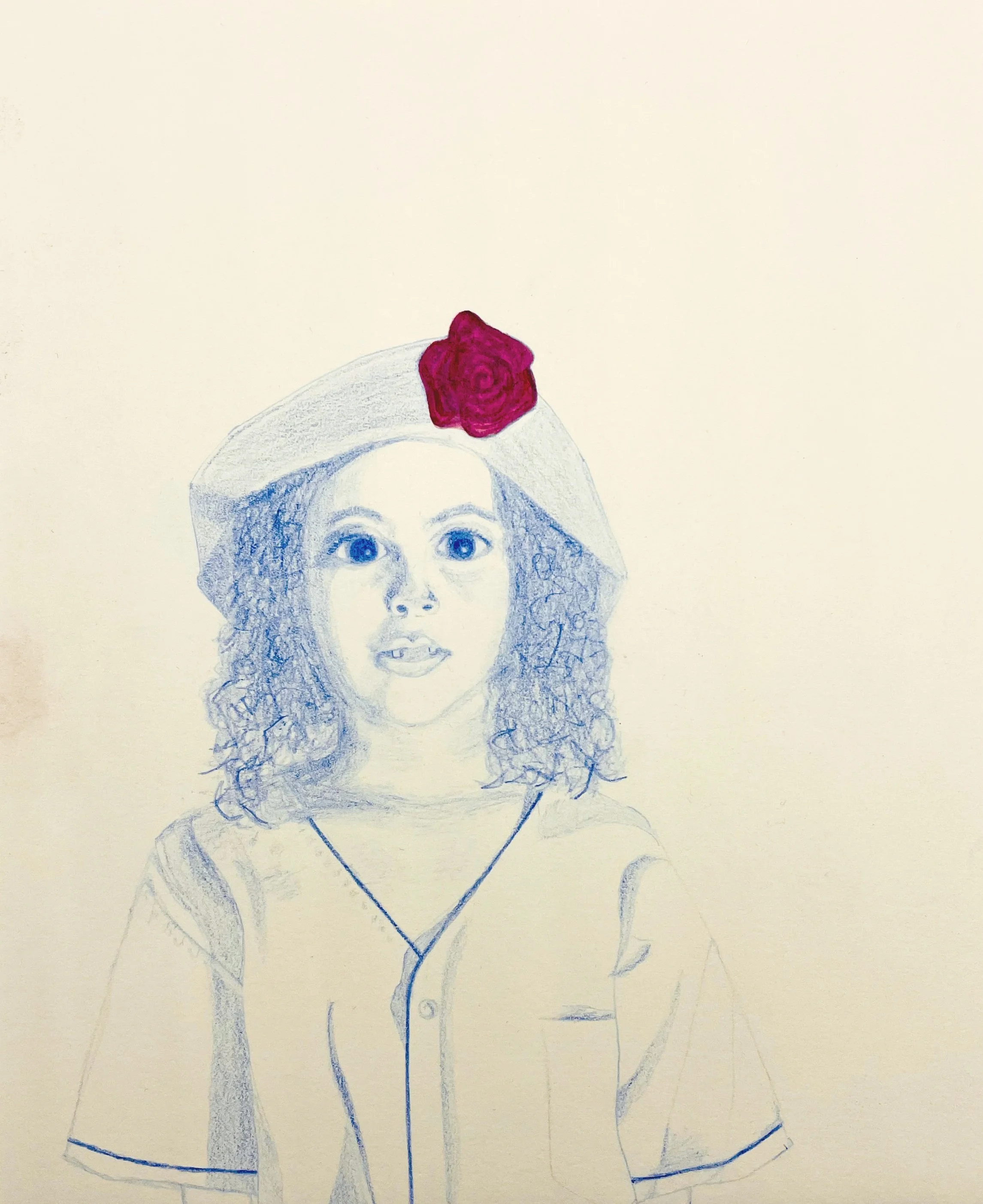 Watercolor, pencil, photo transfer, charcoal, beads, and glitter on paper